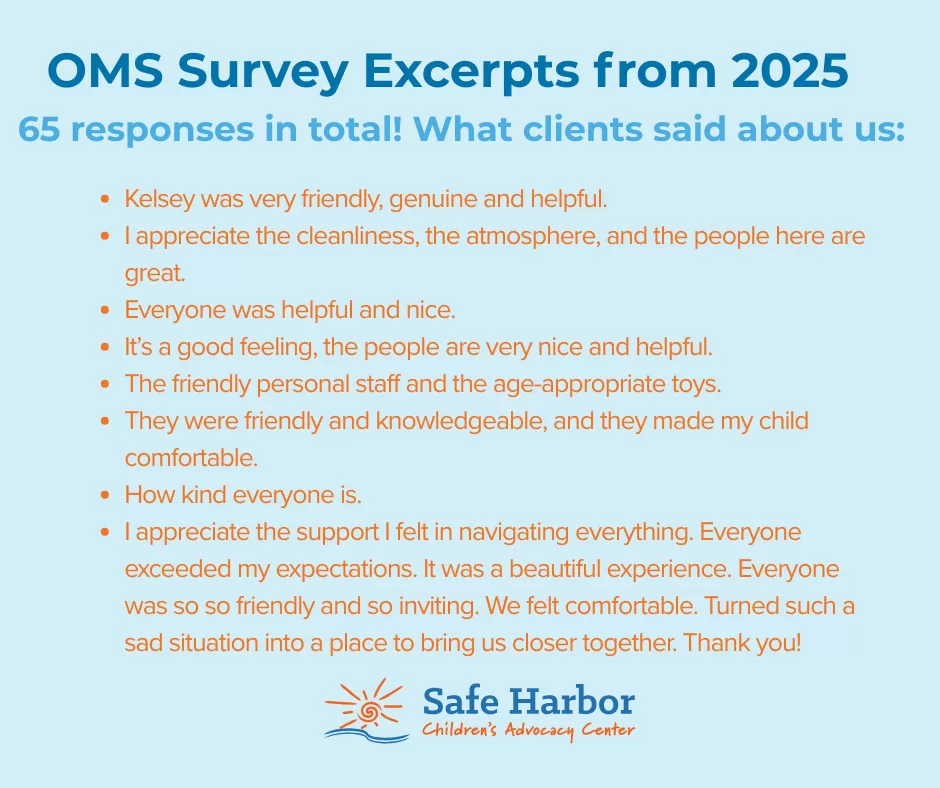 During Forensic Interviews with children, our Family Advocate Kelsey conducts a survey with our families about the services they received from Safe Harbor.